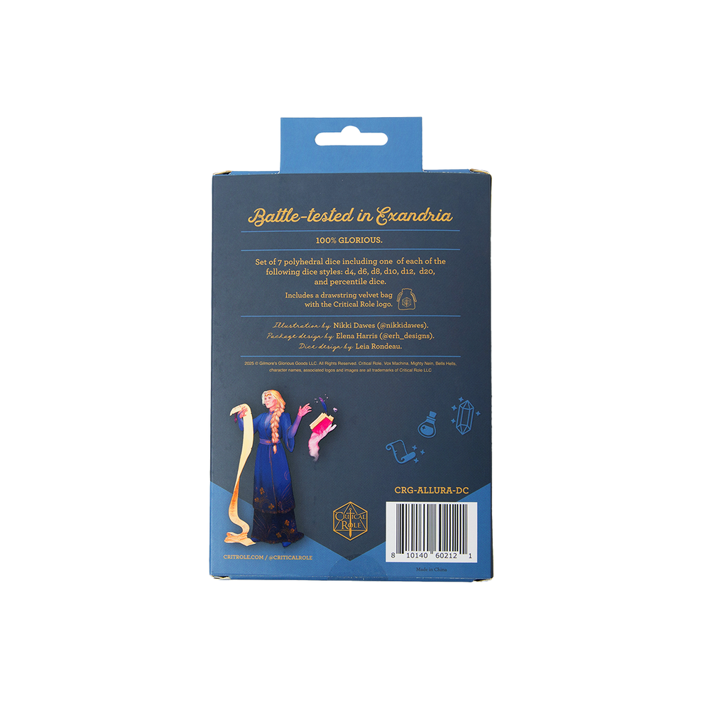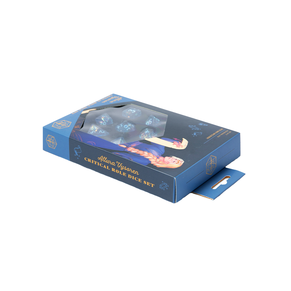 The dice set arrives in a custom designed box with a Critical Role logo shaped window surrounded by art of Allura Vysoren reading a scroll while crystals, potion bottles, and other magical items float towards her.